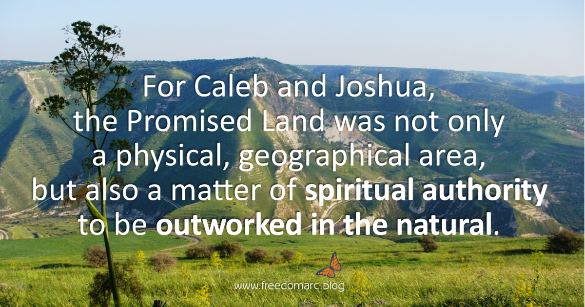 Last time we were considering mountains, and what they represent in scripture. Here again, the hill country speaks of a higher realm. Caleb is talking about moving into that higher authority that God had promised him, that Moses had promised him. He was coming into the Promised Land, and symbolically this represents places of spiritual authority. There were giants living there in those places of authority, in fortified cities, which speak of rulership. For Caleb and Joshua, the Promised Land was not only a physical, geographical area, but also a matter of spiritual authority to be outworked in the natural.