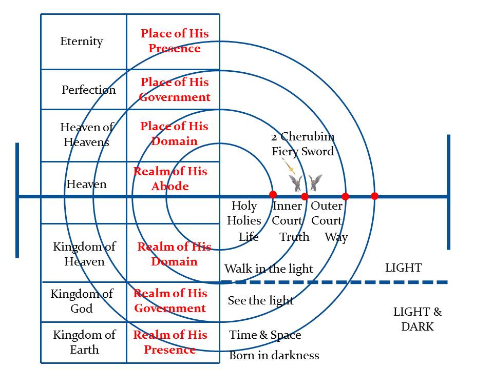This is a diagrammatic representation of seven realms of heaven. Between each of these realms or dimensions are gateways, and there are protocols for passing through them. The two cherubim and fiery sword are there to block the pathway to the tree of life, but Jesus has unblocked that pathway for us as we come through Him, through the cross.