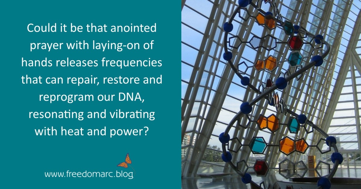 Could it be that anointed prayer and laying-on of hands release frequencies that can repair, restore and reprogram our DNA, resonating and vibrating with heat and power? People have been healed during worship services, as their DNA responded to the sounds of heaven.