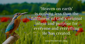 As sons of God we can have and enjoy relationship with the Father, Son and Holy Spirit, and within that relationship we soon discover that we also have responsibility. At the very least, we have responsibility for our own lives and the spheres of influence He has given each one of us already, but as we mature we are called to step into further positions of responsibility: to take our heavenly positions, seated and enthroned, to legislate the kingdom in heaven; to manifest heaven on earth. And ‘heaven on earth’ is nothing less than the fulfilment of God’s original intent and purpose for everyone and everything He has created.