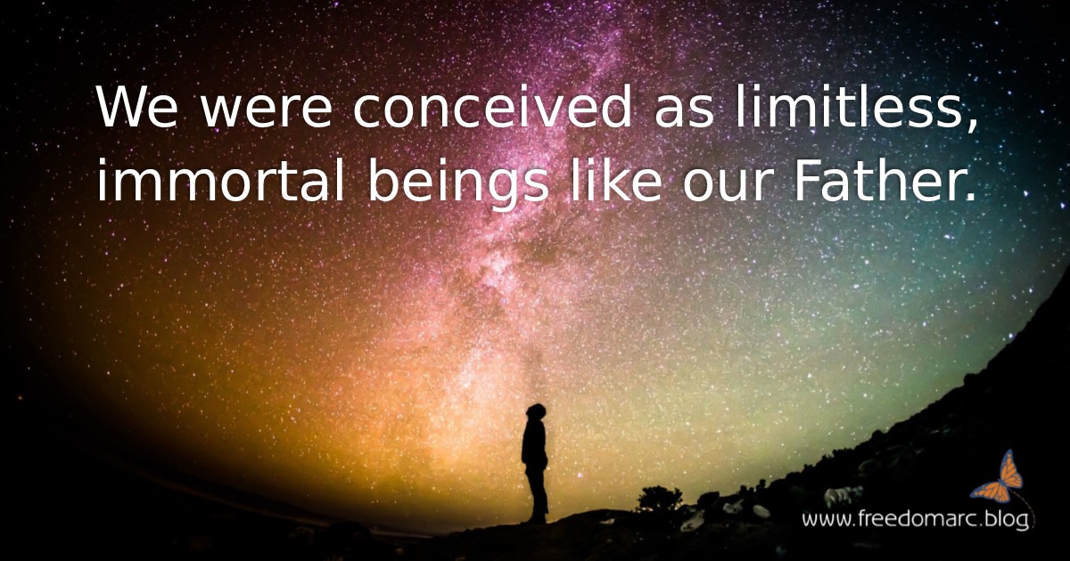 We were conceived as limitless, immortal beings like our Father. He never intended the limited, restricted, finite, mortal existence which mankind now experiences because of choosing the DIY path instead of the Tree of Life. Restoration of our sonship encompasses possibilities far beyond the wildest dreams of even the most creative minds. I can imagine eyes capable of seeing all wavelengths of light, ears capable of hearing all wavelengths of sound, bodies capable of multidimensional travel and existence, minds capable of creative expression, bodies capable of instantaneous healing. I can imagine doing the works Jesus did, and greater works: controlling the molecular structure of water, becoming invisible, creating and manipulating matter, telepathy (knowing people’s minds and hearts) and telekinesis (‘immediately the boat was at the land to which they were going’), creative thought, translation, bilocation, pre- and post-cognition, time travel…