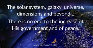 If there were no government in heaven, we would not have government on earth. Whatever is on earth is a reflection of what is in heaven – it is just that earthly government is inevitably flawed because no earthly do-it-yourself governmental system is ever going to be what God’s government is in heaven. The purpose of government is to bring order, so that people can live in a place of safety, security, blessing and empowerment. God’s kingdom is the blessing to empower us to be fruitful, to multiply, to fill the earth, to subdue all obstacles and to rule – and then to expand that out into the rest of the solar system, galaxy, universe, dimensions and beyond – because there is no end to the increase of His government and of peace.